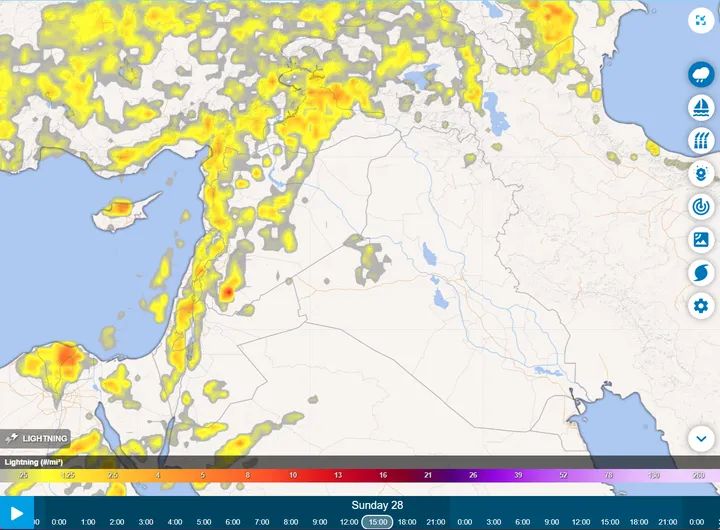 - بداء من ظهر وعصر يوم الاحد يوم الاثنين امطار غزيرة مرافقه حدوث العواصف الرعديه ربما الصواعق تساقط البرد اغلب المناطق خصوصا المناطق الجنوبيه واقليم العقبة على وجه التحديد...